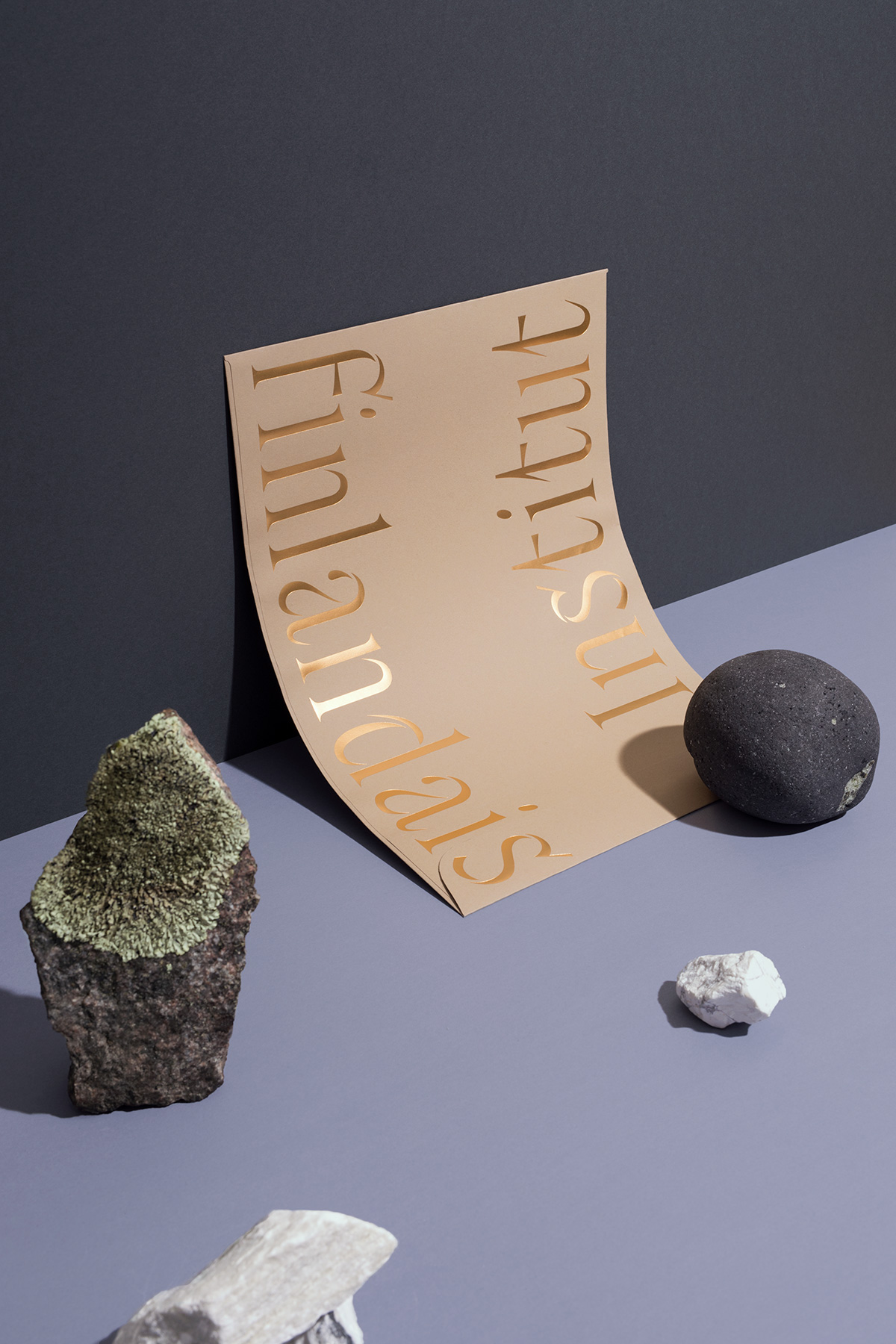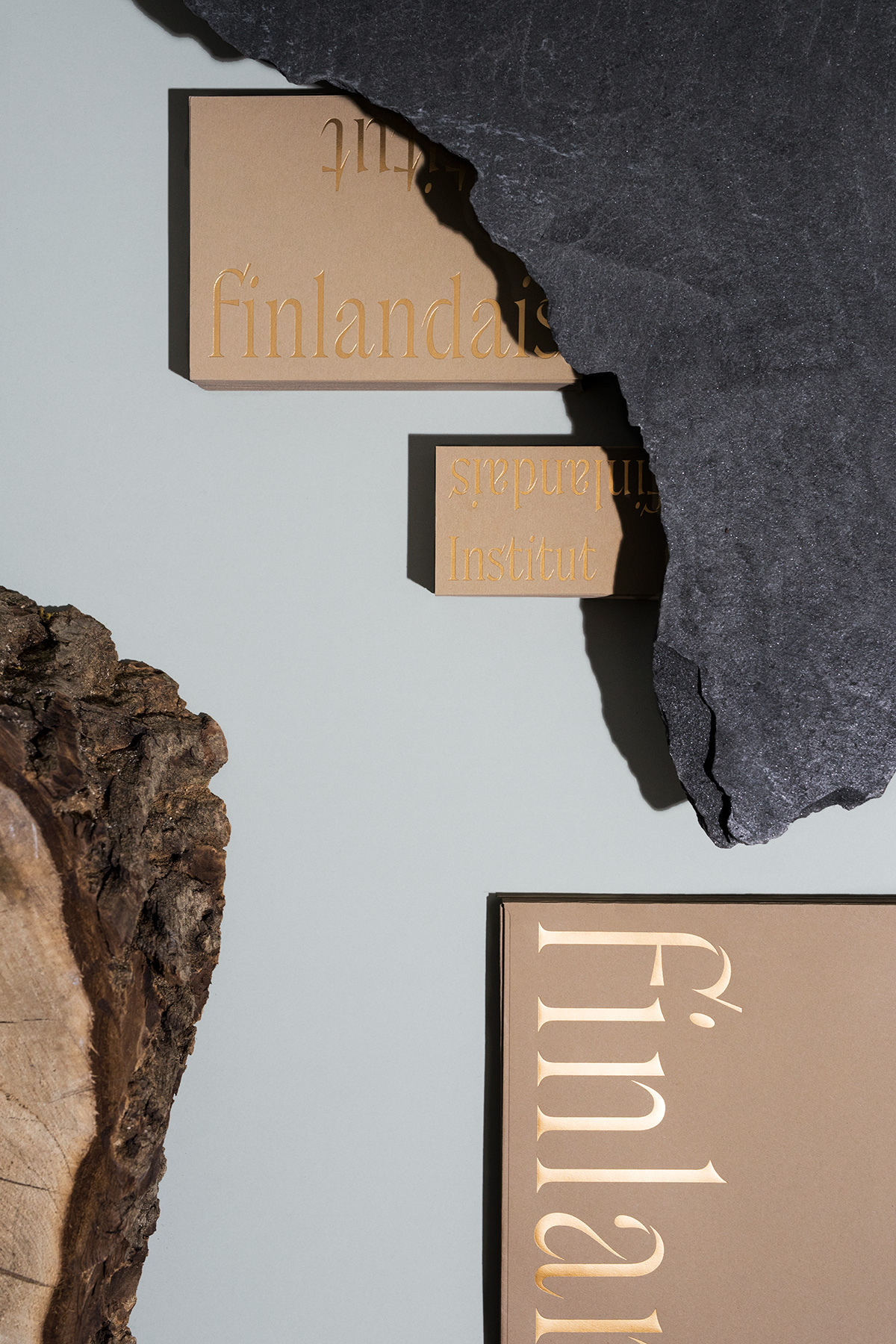 The redesign of the Institute visual identity was in part inspired by the structure and colours of the architecture, of the Institute itself. The identity aims to portray Finnishness that is at once earthy and natural yet sophisticated and timeless. Together with Juho Hiilivirta, Niklas Ekholm, from Helsinki Type Studio, we created a custom typeface conceptually rooted in cultural exchange. We took the connective role of the institute quite literally by making the letters reach out to each other like in a connected cursive script. The end result is an identity that surprises, with very tactile contrast between the choice of materials, natural recycled paper, glossy brass foil and the delicate yet confident typeface.